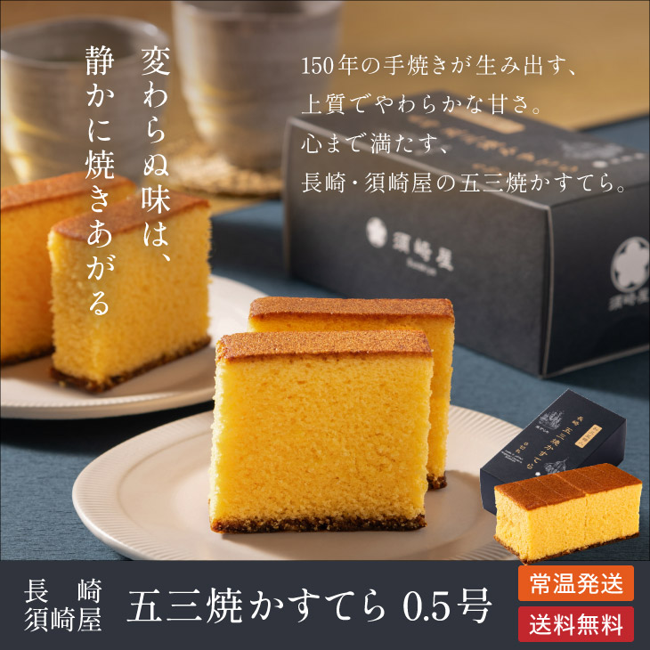 創業慶応3年、須崎屋がこだわり抜いた製法で1枚1枚丁寧に焼き上げた五三焼カステラです。